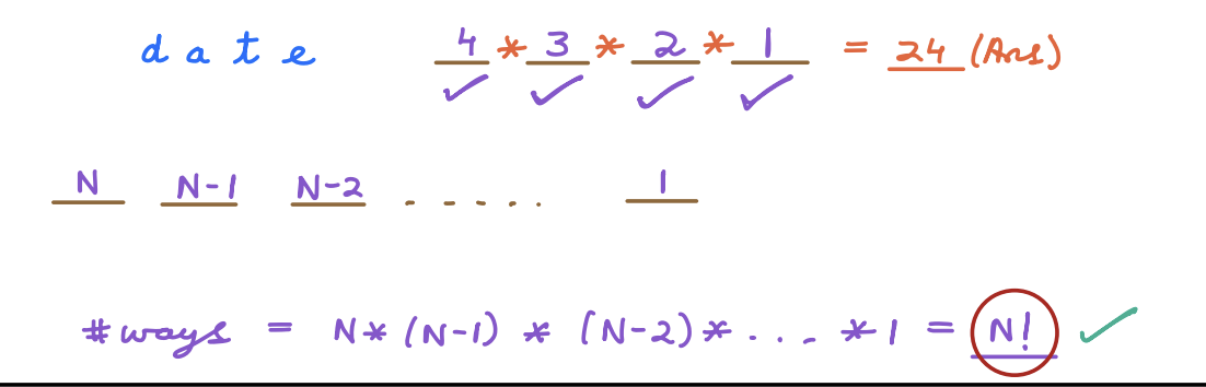 Thus, the total number of ways to arrange R characters out of N distinct characters is N ∗ (N − 1) ∗ (N − 2) ∗ ... ∗ (N − (R − 1)).