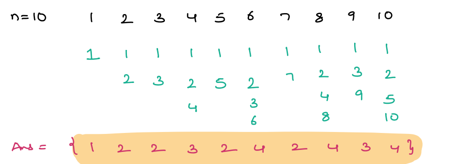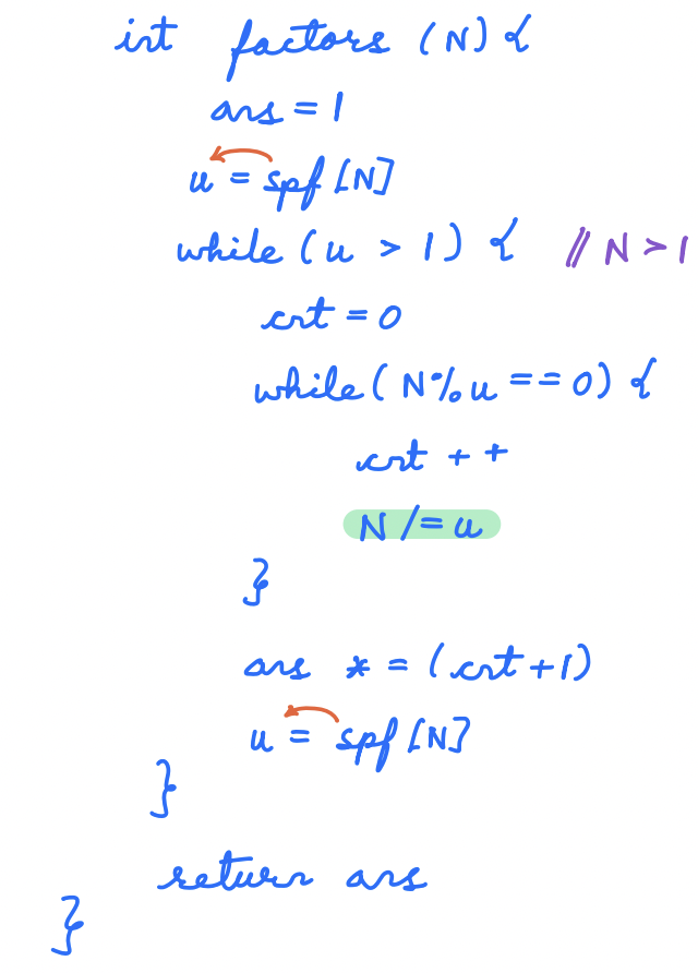 - Time Complexity (TC): The time complexity of this code is O(N * log N), mainly due to the prime factorization process for each number from 1 to N.