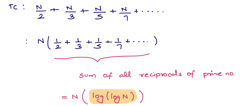 - Space Complexity (SC): The space complexity is O(n), which is used to store the boolean array indicating whether each number is prime or not. The space used is directly proportional to the input size N.