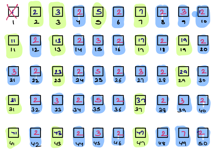 - Smallest Prime Factor Determination: Starting from the first prime number (2), for each prime number: