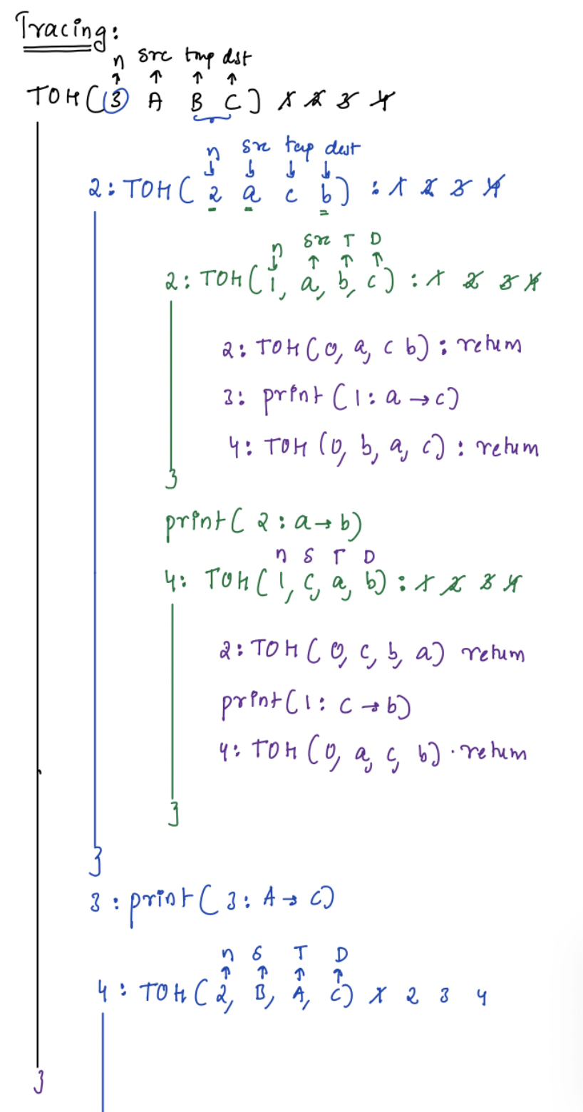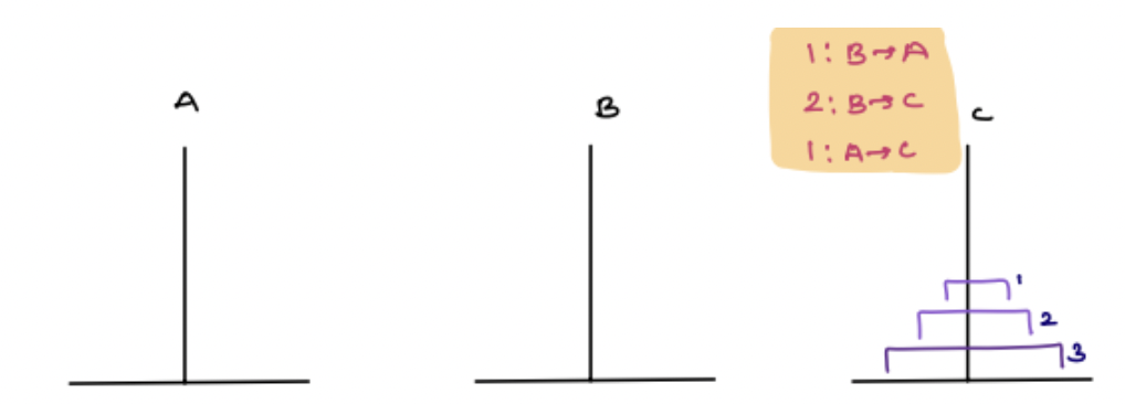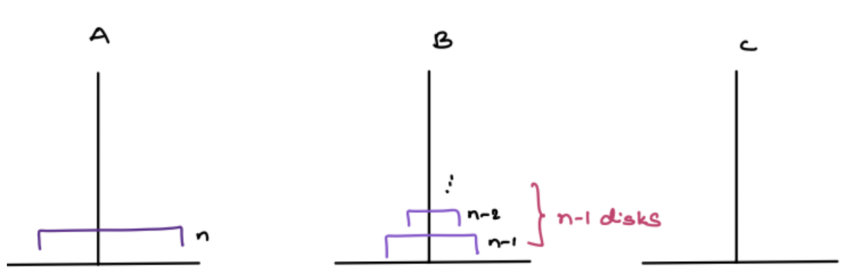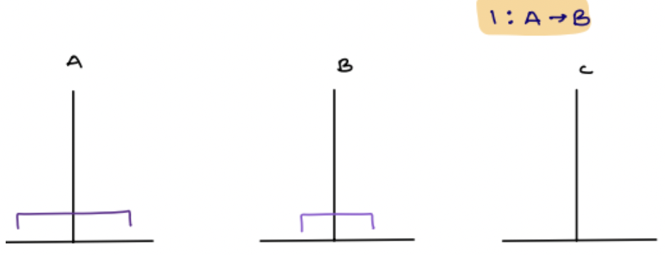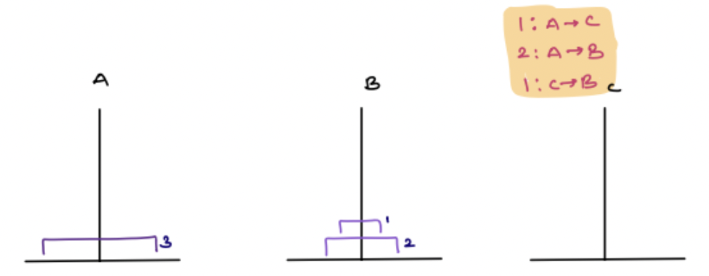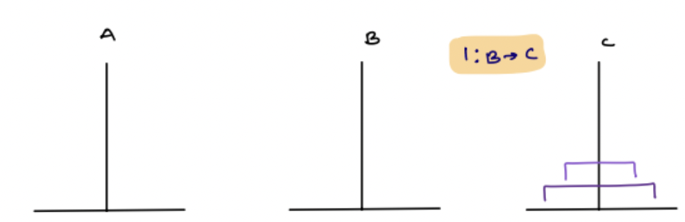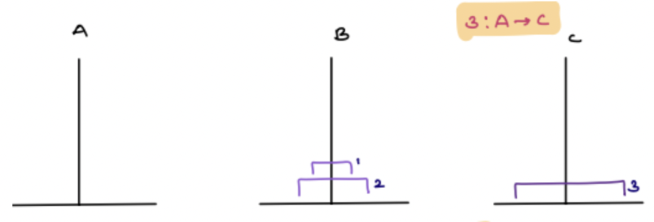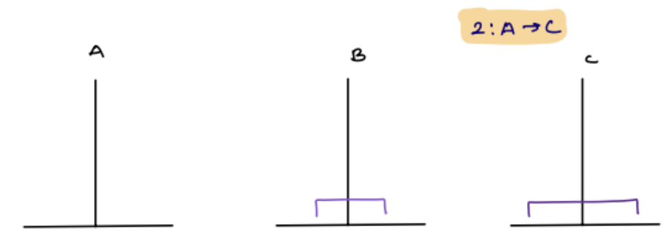 2. TOH(n - 1, A, C, B); // move n-1 disks A->B