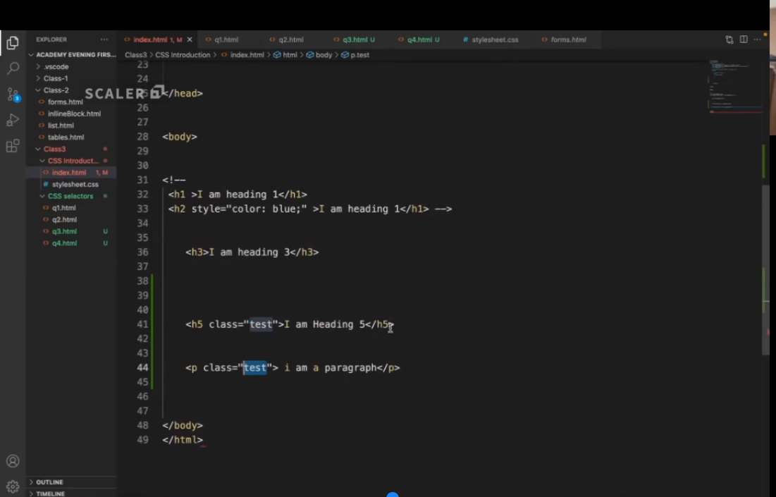 - We use dot (.) to select a class and apply CSS to them. Here the name of the class is test so we will apply CSS to this class as below: