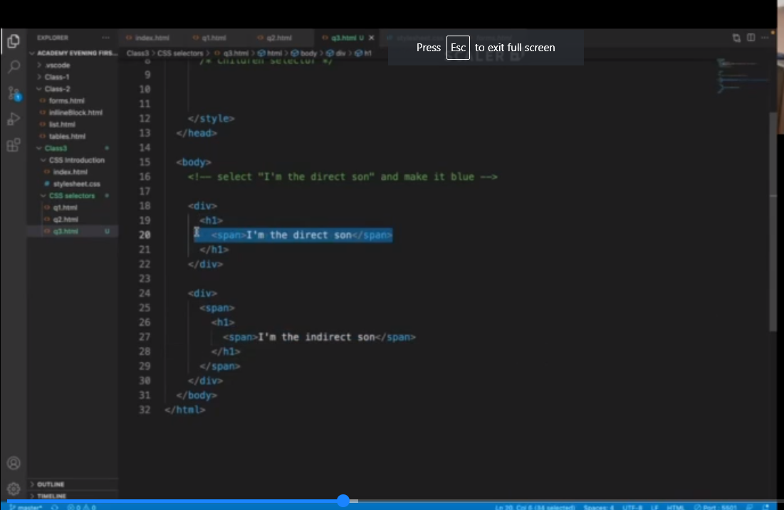 There are two span tags. Here we need to make the text "I am the direct son" blue using CSS.