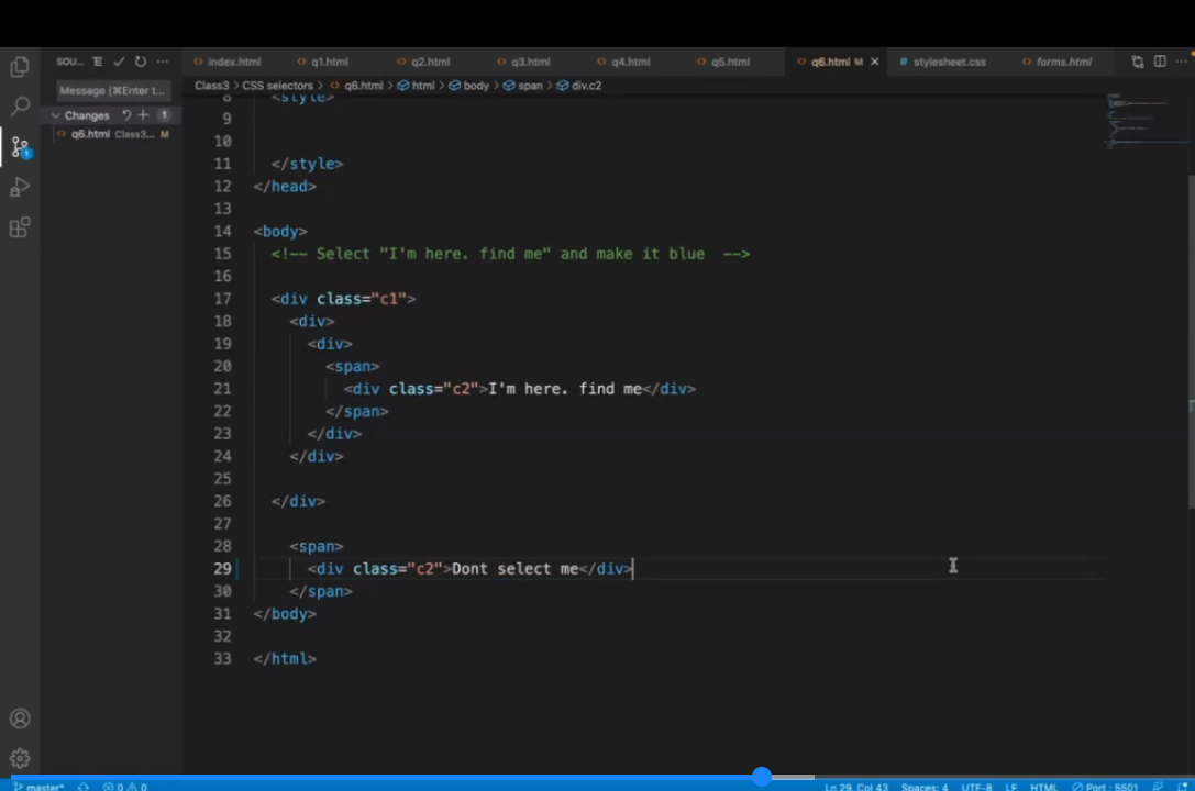 You have to make the text "I'm here, find me" blue as shown in the question image below. Feel free to use any selector or combination of selectors you want.