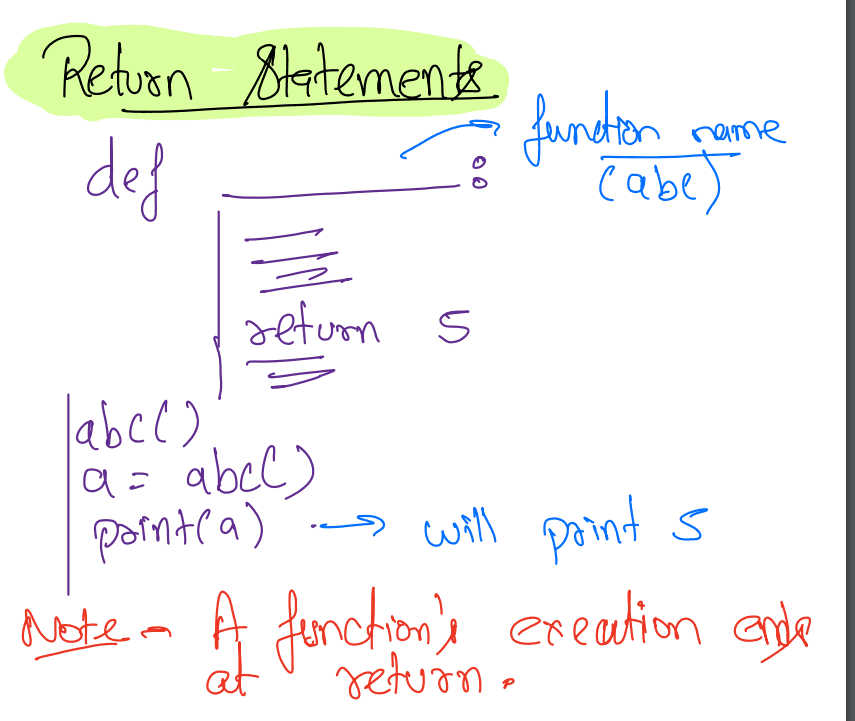 Note: Functions execution ends at return. Once a return statement is found rest of the lines of the code will not be executed. It is just like a break in loops.